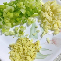 1蔥姜蒜切末,起鍋燒油,放入蔥姜蒜爆香,加入豬肉末翻炒。